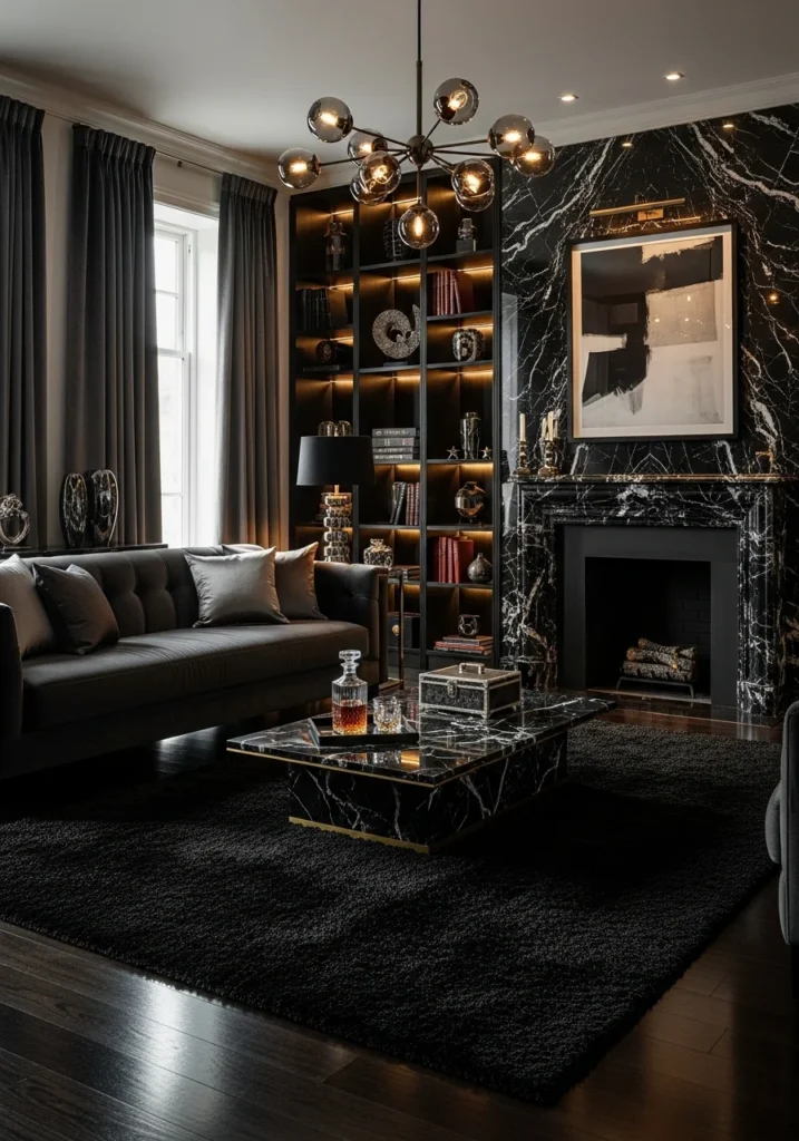 16. Dark Luxury Rich Living Room with Black Marble