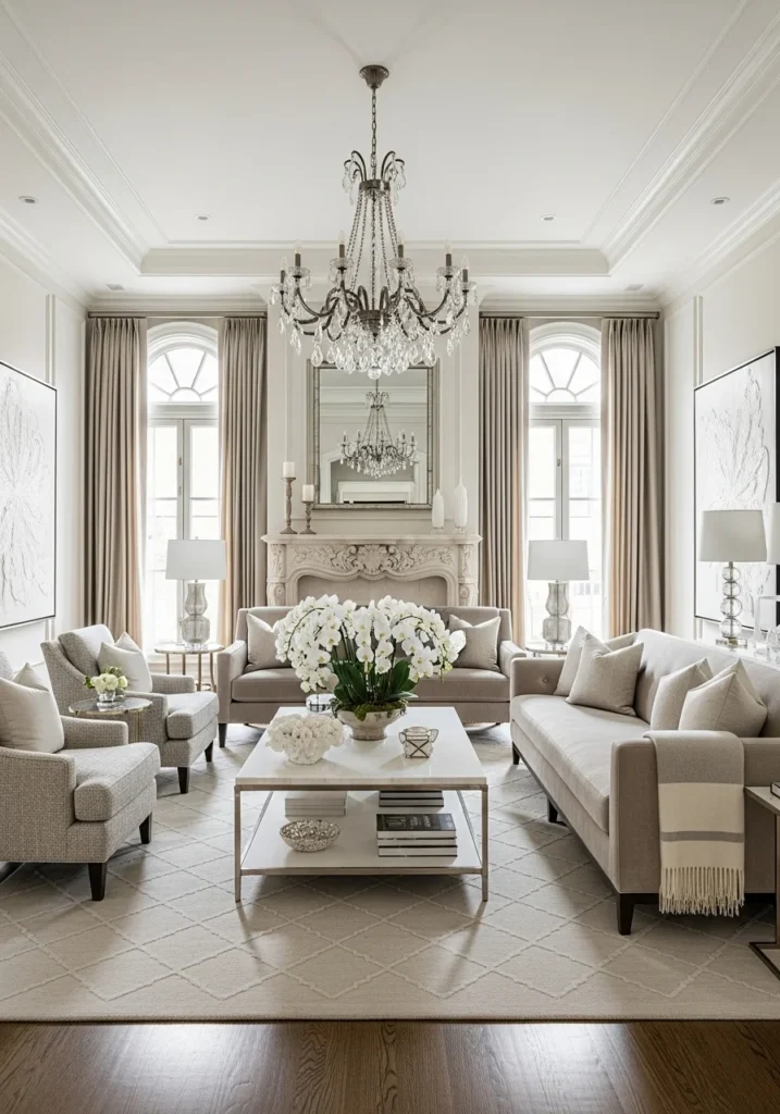 21. Elegant Rich Living Room in Neutral Monochrome Palette