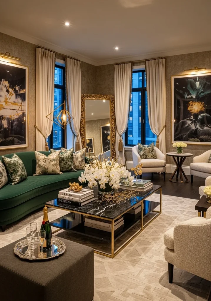This rich living room is anchored by an elegant emerald green velvet sofa that introduces depth, color, and sophistication to the space. The rich hue serves as a striking focal point while maintaining harmony with the surrounding neutral tones. Gold décor elements are thoughtfully integrated, adding warmth and enhancing the overall sense of luxury.
