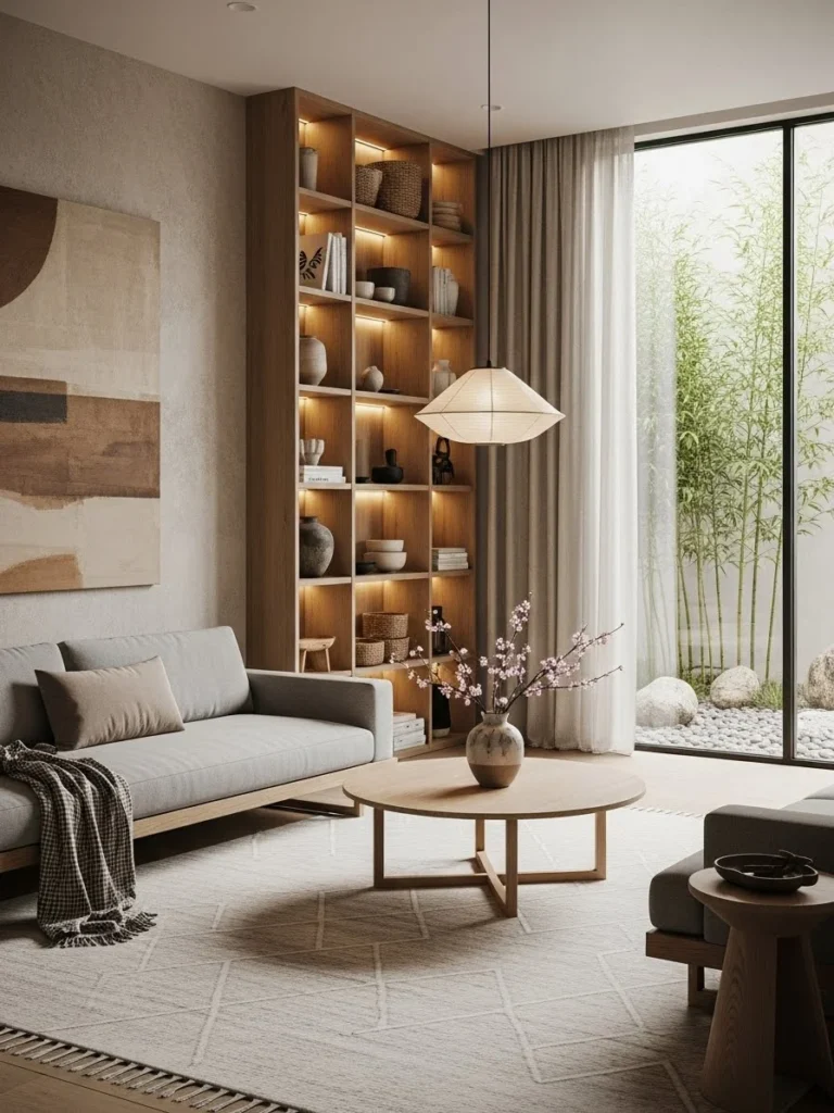This Japandi-style rich living room blends Japanese minimalism with Scandinavian warmth to create a serene luxury environment. Natural wood elements, clean lines, and uncluttered spaces define the design, promoting calm and balance. The minimalist approach emphasizes quality over quantity.