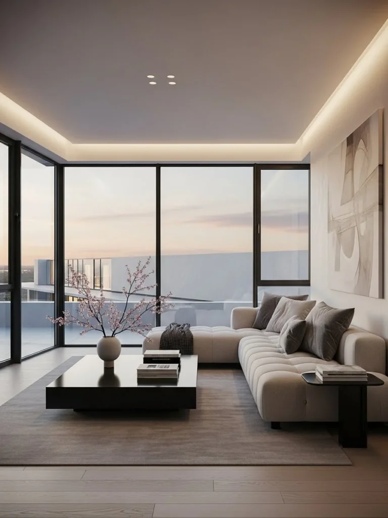 04. Minimalist Rich Living Room with Floor-to-Ceiling Windows