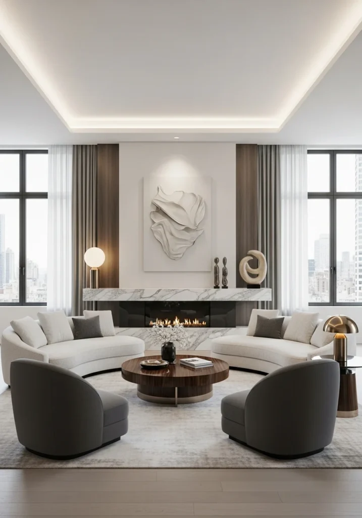 This modern rich living room embraces contemporary design through sculptural curved furniture that softens the overall aesthetic. The warm beige palette enhances visual continuity, creating a soothing and cohesive environment. The design reflects emerging 2025 interior trends focused on organic forms and refined minimalism.