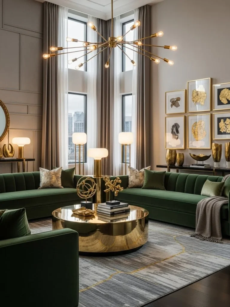 02. Modern Rich Living Room with Velvet Sofas and Brass Décor