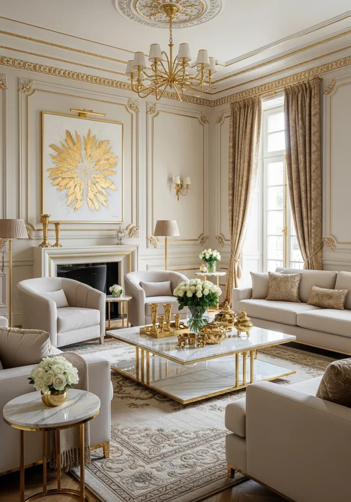 This modern royal rich living room blends contemporary design with regal detailing through the use of elegant gold trims. Clean architectural lines are elevated by metallic accents, creating a sophisticated yet commanding presence. The color palette remains refined, allowing the gold elements to stand out with subtle authority.