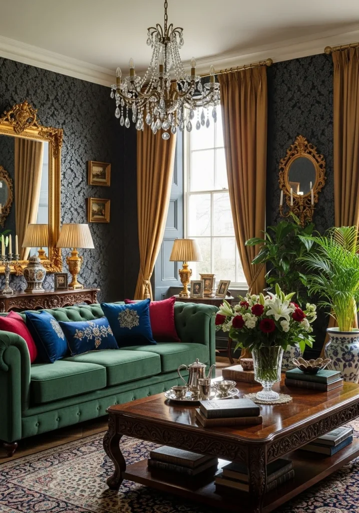 11. Rich Living Room with Emerald Green Velvet Sofa
