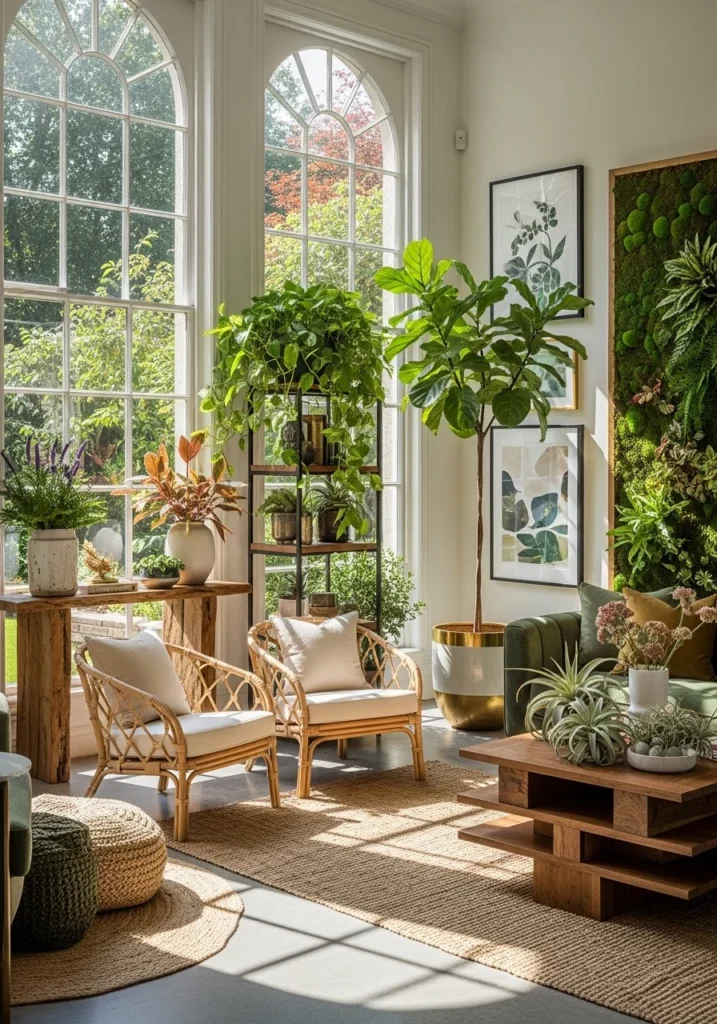 28. Rich Living Room with Indoor Plants and Biophilic Design