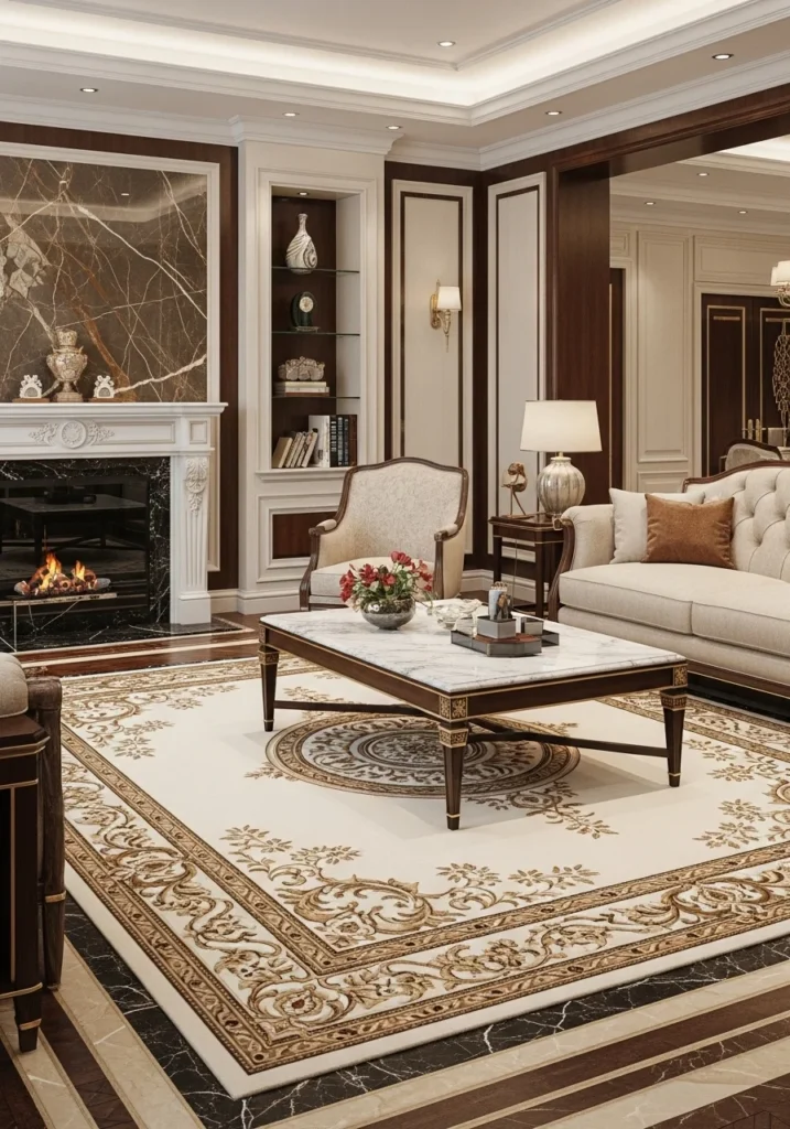 22. Rich Living Room with Luxury Rug and Marble Accents
