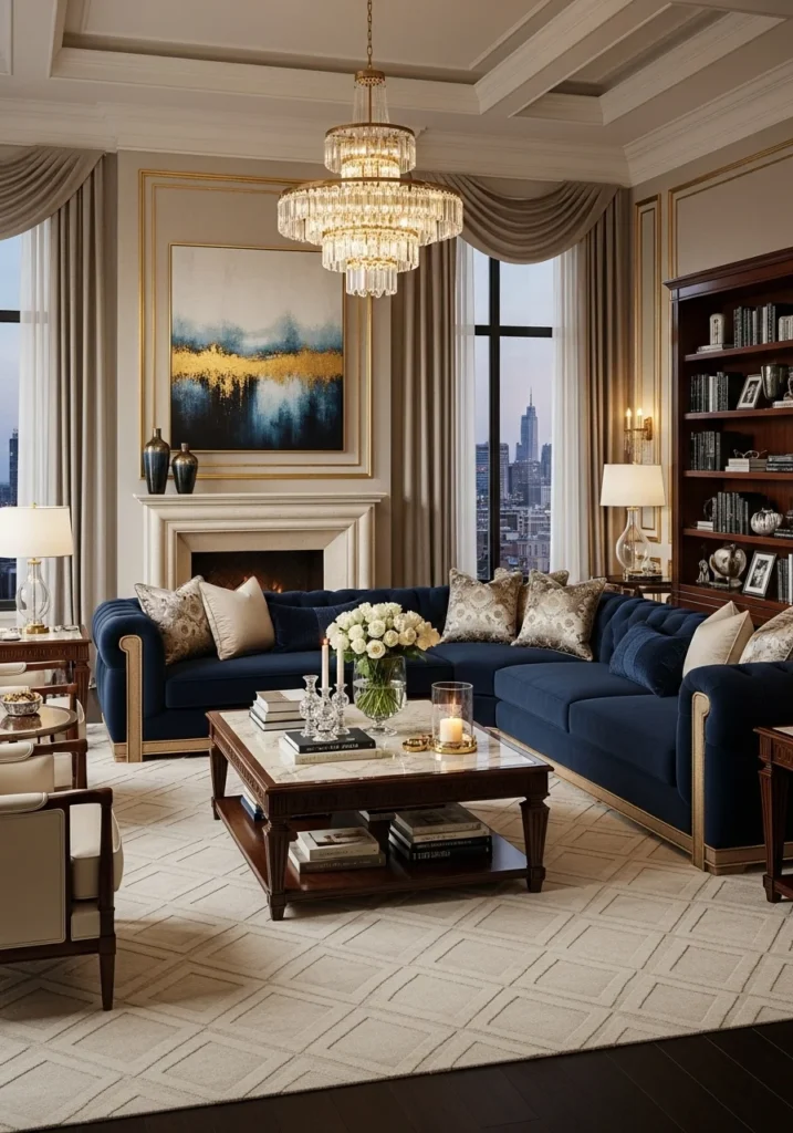 This classic rich living room captures timeless luxury through ornate detailing and regal color composition. A magnificent crystal chandelier serves as the focal point, casting shimmering light across intricately carved wooden walls. The royal blue and gold color scheme reinforces a sense of heritage, grandeur, and aristocratic refinement.